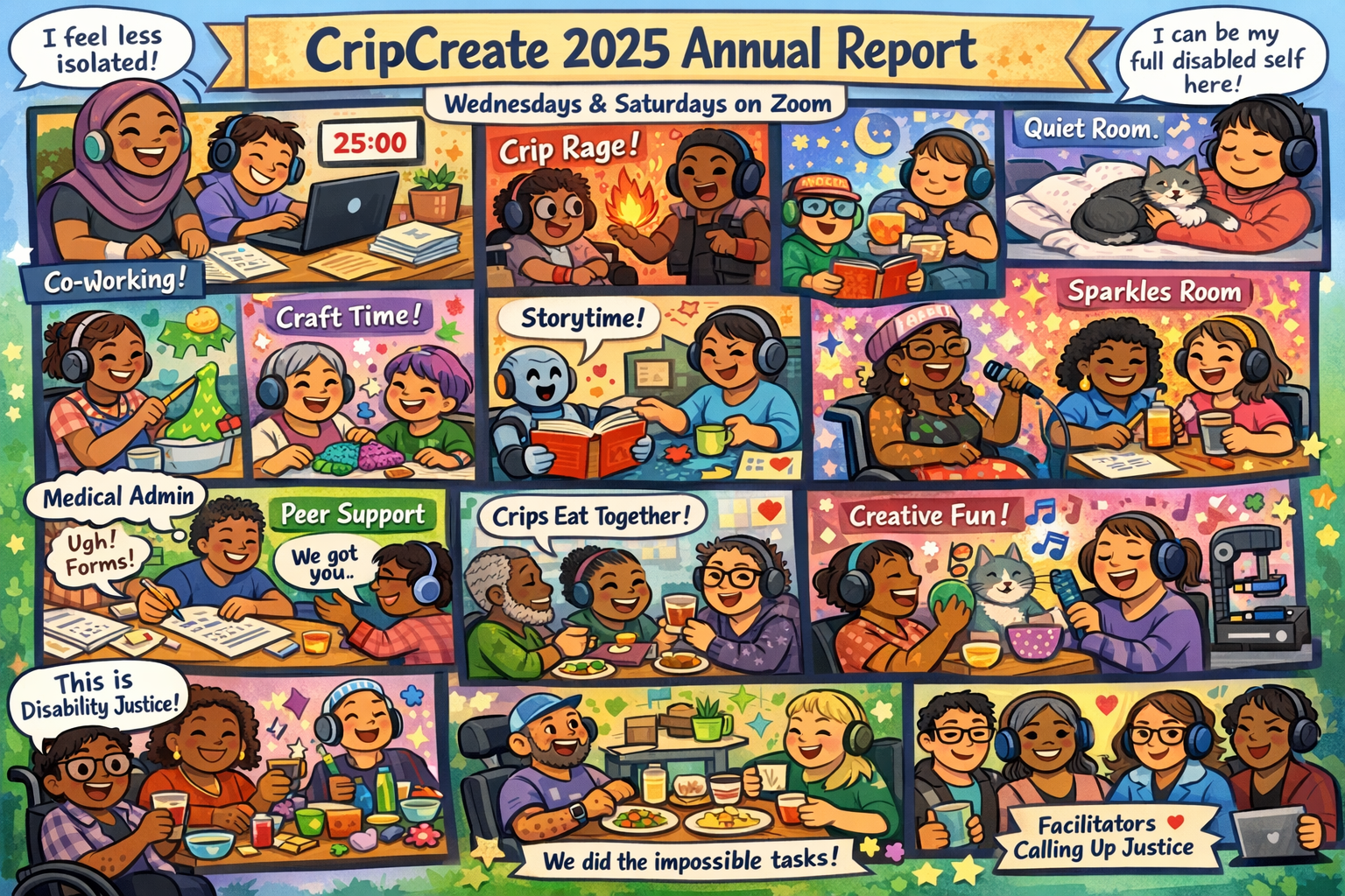 Introduction Crip Create is a weekly online co-working and socializing space centered on Disability Justice, created by and for Disabled people. It meets consistently on