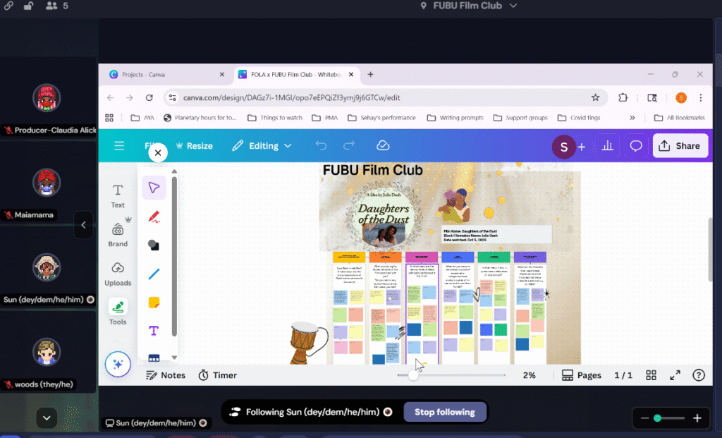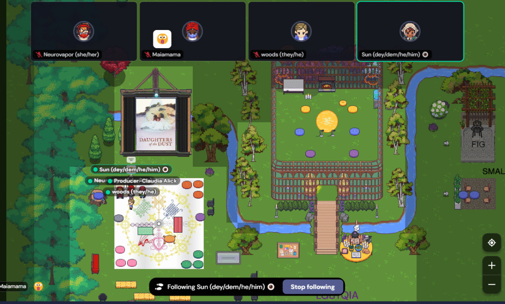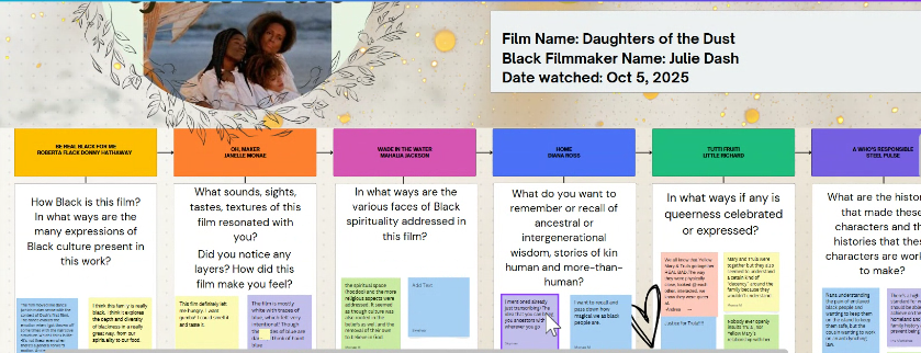 Together, we gathered in the Calling Up Justice Digital Encampment on the GatherTown platform, transforming our virtual campus into a vibrant watch-party environment complete with accessible note-taking, digital placemaking, and shared reflection tools. Participants joined from across geographies and experiences to watch and discuss two iconic works by filmmaker Julie Dash. This event took place in Oct 5 2025.