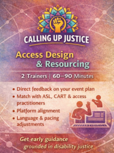Calling Up Justice shares best practices from years of producing gatherings that center disability justice, collective care, and rapid response. This session will focus primarily on digital event organizing as a powerful tool for movement work.